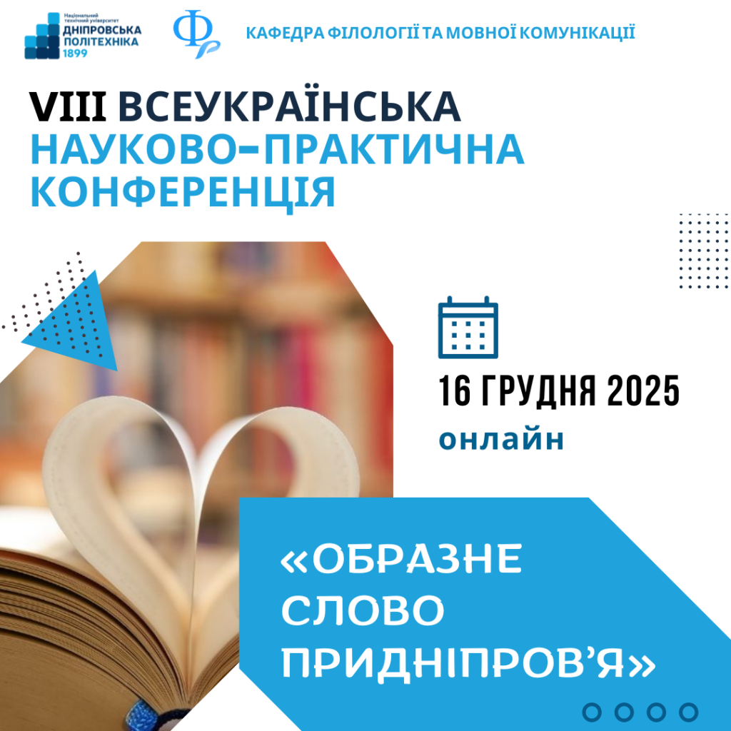 Запрошуємо до участі у VIIІ Всеукраїнській науково-практичній конференції «Образне слово Придніпров’я», яка відбудеться 16 грудня 2025 року в онлайн-форматі. Посилання для реєстрації: https://docs.google.com/forms/d/e/1FAIpQLSd84eF48Ua13M14sby9mo5DHCohv5ILHPx7kRzGRHYZplWv_w/viewform?usp=header